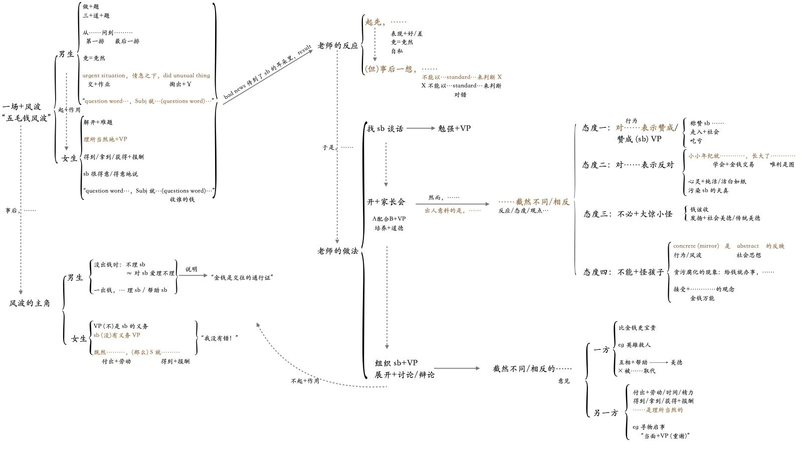 Text visualization helps students to figure out the structure of the text and retell the text using the target structures. This is also a useful tool for TAs when tutoring students. Below is an example based on “金钱是交往的通行证吗?” of Princeton University textbook “All Things Considered (事事关心)”.